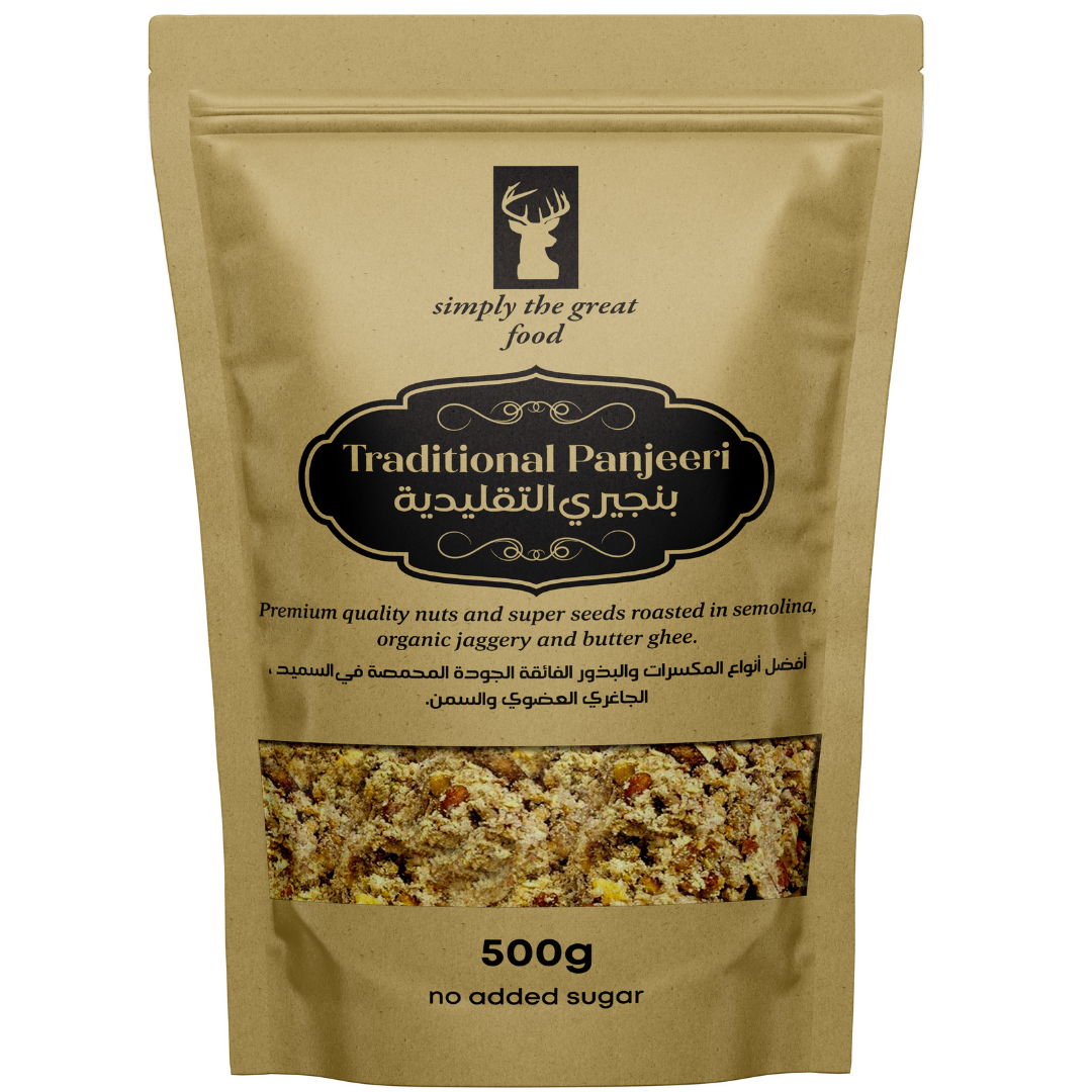 Traditional Panjeeri – A healthy mixture of nuts, super seeds, dried fruits and semolina lightly toasted in fresh Desi Ghee and ground into a coarse, crunchy mix.